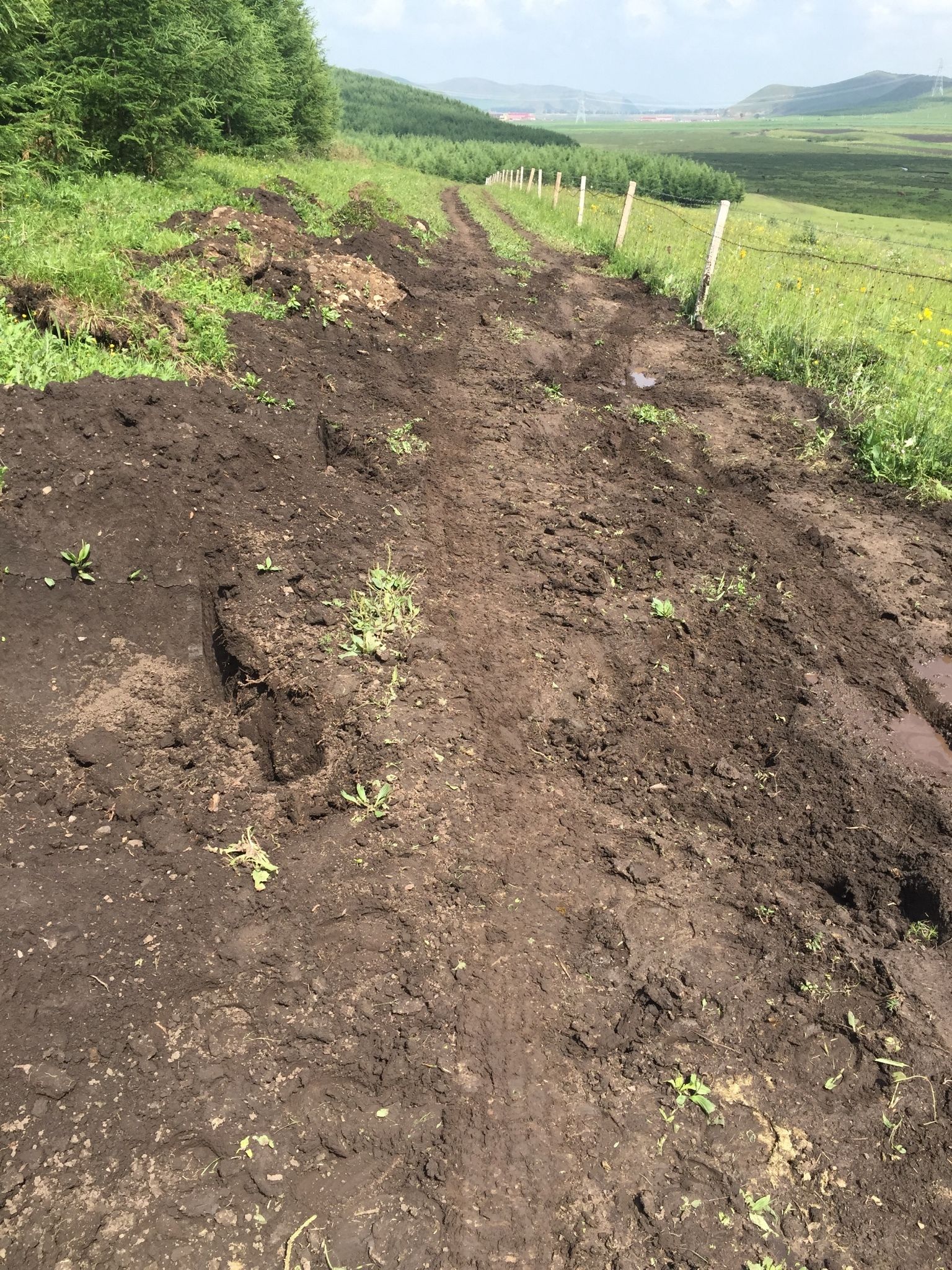 继续往前走,我们几乎和别人穿越的轨迹是并行的,稍微踏实些,路面湿滑,顺着车辙小心翼翼的上了山坡,突然看见地面上全是人工挖的7、8个深深的不规则排列的炮弹坑,旁边紧挨着又是密布的铁丝网,稍微侧滑就会蹭到旁边的铁丝网不让走用这招也是够气人的!!……老白发力,晃晃悠悠通过,但在侧滑时也蹭到了旁边的铁丝网,留下了深深的印记,刚刚喷的漆啊,心疼