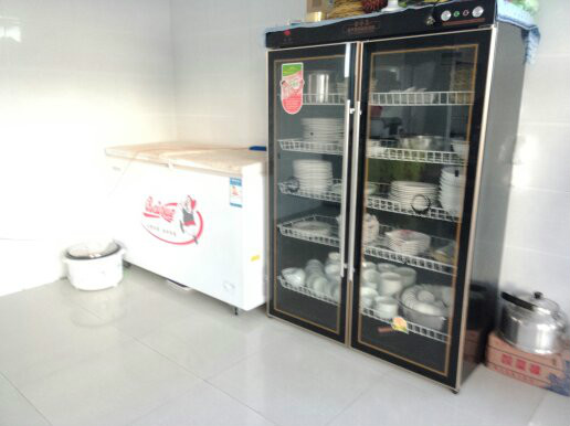 这是他家的厨房,很干净,角落里还有消毒柜,让人吃着放心,看着舒心。