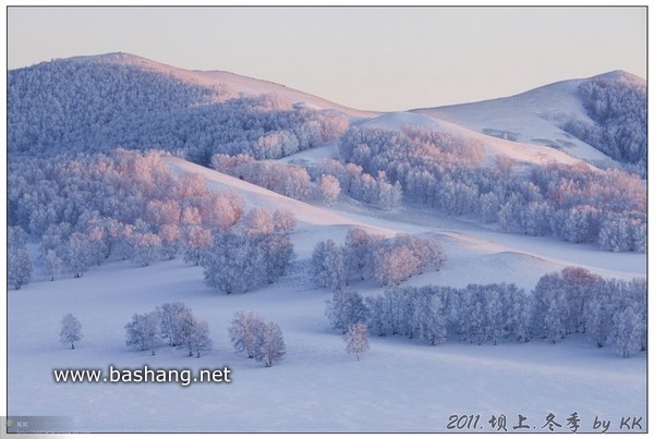 单是白色是不够的!西边远处的山峰随着东边太阳的升起,渐渐笼罩上一层粉红的云霞....