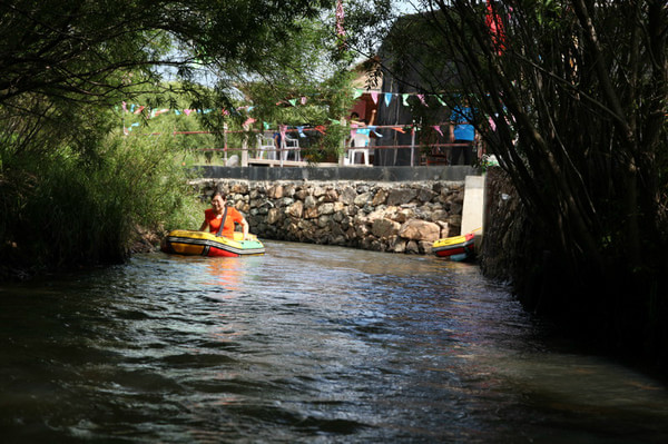 漂流河两侧被茂密的柳树覆盖,中间仅有一条不宽的缝隙可以看到蓝天白云,在河 中漂流倒也十分的凉爽。